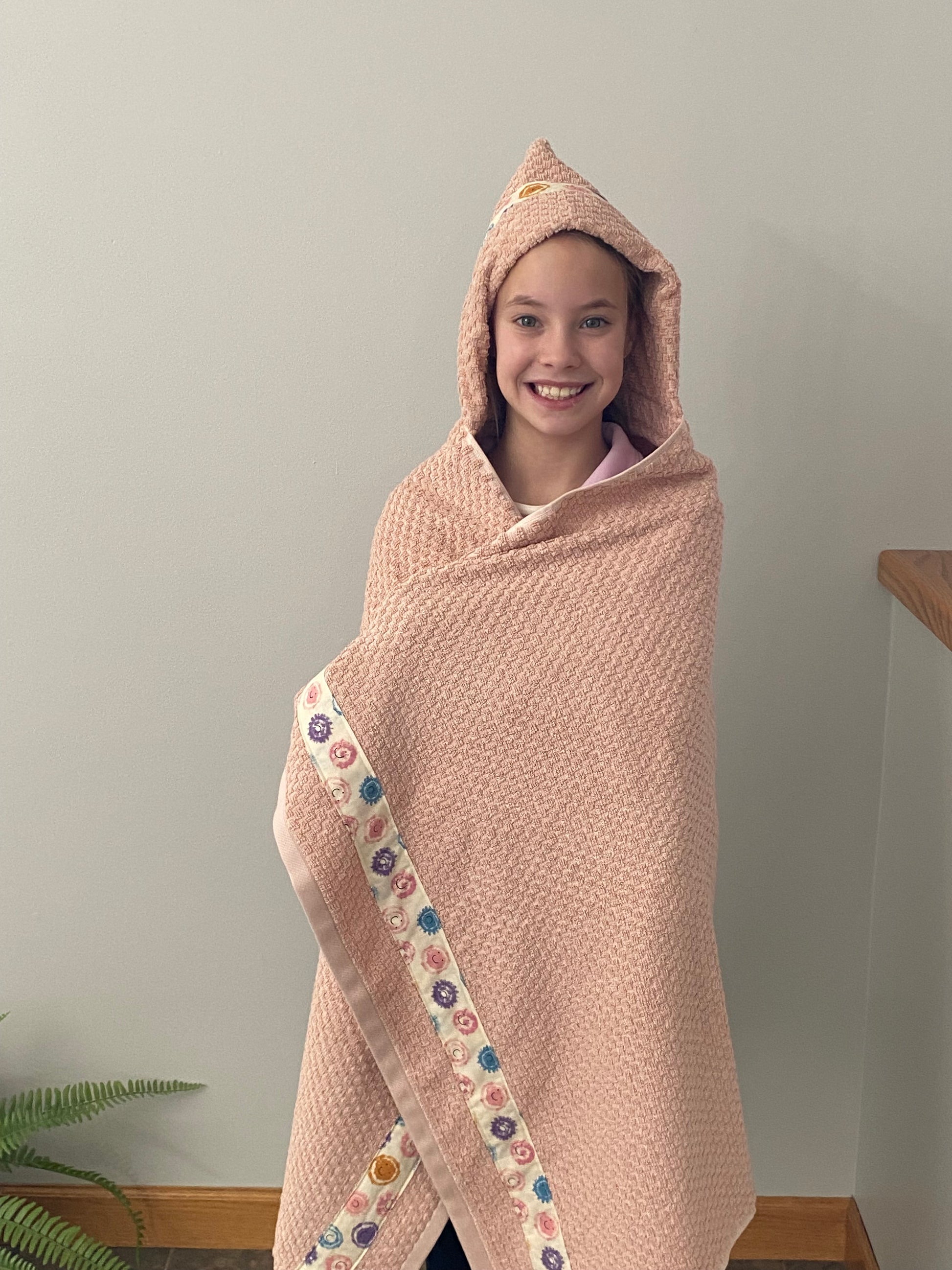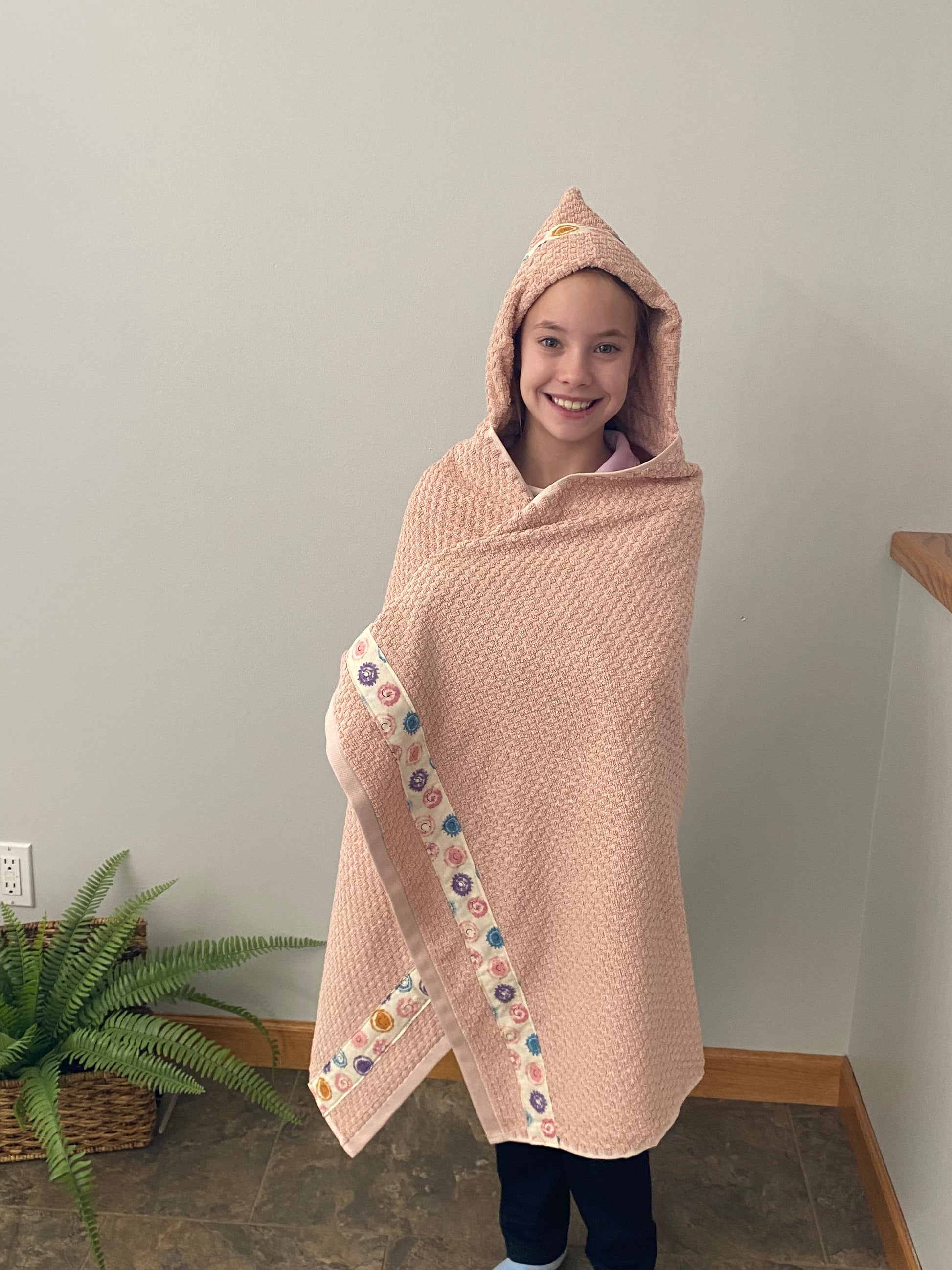 This hooded towel is carefully crafted by hand. Measuring 54"L x 30"W, it's a standard size with a convenient hood, and comes with a matching washcloth.