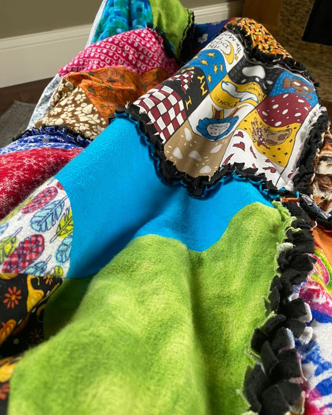 Memory blankets can be created using special shirts from memorable events like concerts, sports games, or items from a special loved one. The image displays a patchwork quilt made with dog bandanas from my two beloved shitzus. The price may differ depending on the additional materials used for the creation of the blanket (such as backing and batting). Please feel free to reach out and discuss the limitless possibilities with me.